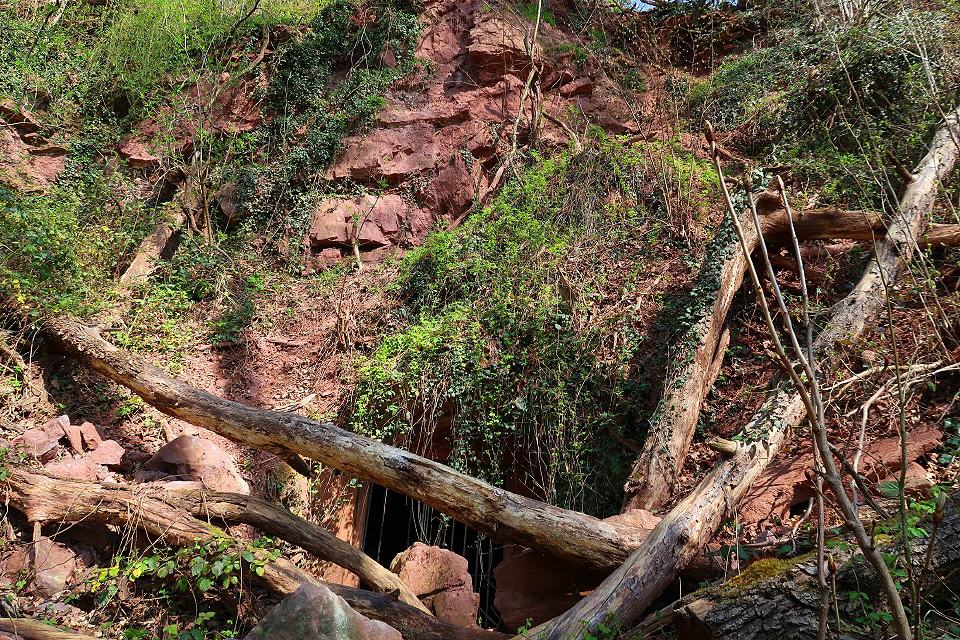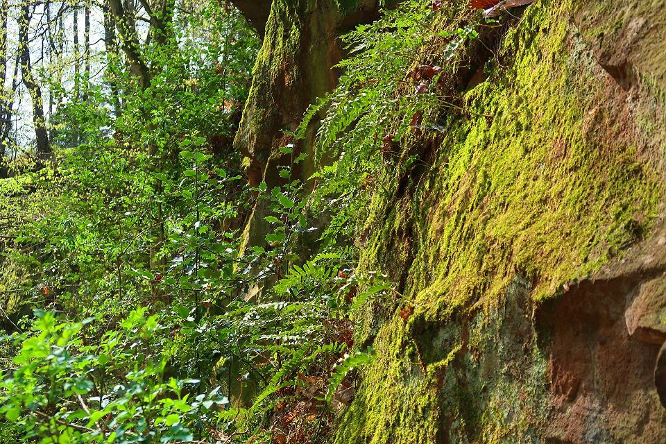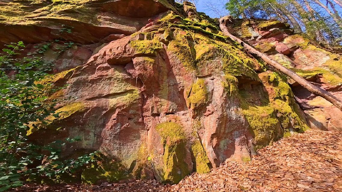 Der Pfad entlang der Steinbrüche stößt auf einen breiten Fußweg, dem man nach links durch steileres Gelände folgt. Sandsteinfelsen stehen am Weg an. Nach rund 250 m des enthalten sie größere gelbe Partien. Mit etwas Glück findet man hellgelbe verkieselte Sandsteine mit dünnen Schwerspatbelägen. 550 m weiter öffnet sich auf der linken Seite eine große und bis zum Kamm reichende Geländemulde. Felsnasen stehen hervor, ansonsten überwiegt Gesteinsschutt. So sieht ein gut 800 Jahre alter Steinbruch aus, der feuchten Klimabedingungen mit starkem Baumbewuchs ausgesetzt ist. Auffällig ist der nun gelbliche Sandstein. Dabei dürfte es sich um den wichtigsten Burgsteinbruch handeln, denn die Burg besteht ganz überwiegend aus gelblichem Sandsteinmauerwerk.