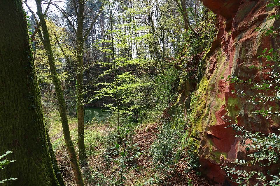 In südliche Richtung führt ein noch immer gut erkennbarer Weg nach Sexau. Der Jägerpfad steigt nun steil nach Norden an. Über einen kleinen Pfad links des Weges erreichen wir nach 350 m den größten Steinbruch. Man kann ihn in einem Bogen knapp unterhalb der Bruchwände durchwandern. Die Brüche reichen bis zur Kammlinie und ziehen sich über 230 m hin. Am Fuß der steilen Wände hat sich ein Tümpel gebildet. Auffällig ist der rot dominierende Sandstein, obgleich ebenso gelbe und braune Varietäten zunehmen. Händische Abbauspuren und senkrechte Bohrpfeifen sind Zeugen des letzten Abbaus.