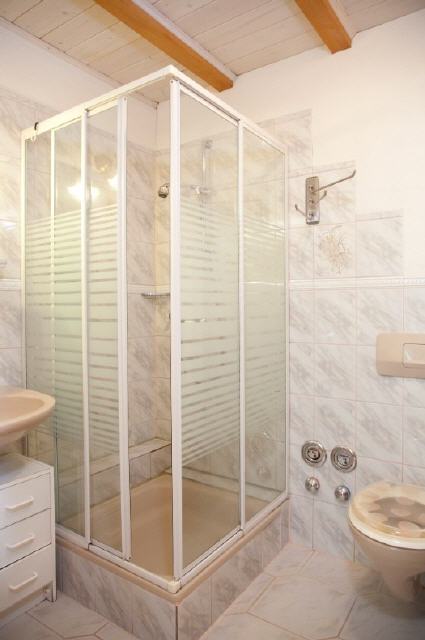 Untere Ebene: Wohnbereich mit Kachelofen; überdachter Balkon, Korkboden, Holzdecke, Küche, Bad mit Dusche und WC.