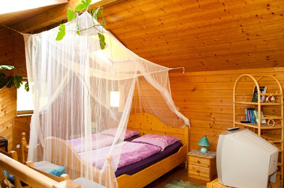 Obere Ebene: Galeriebereich mit Schlafplätzen und Giebelzimmer mit Doppelbett.