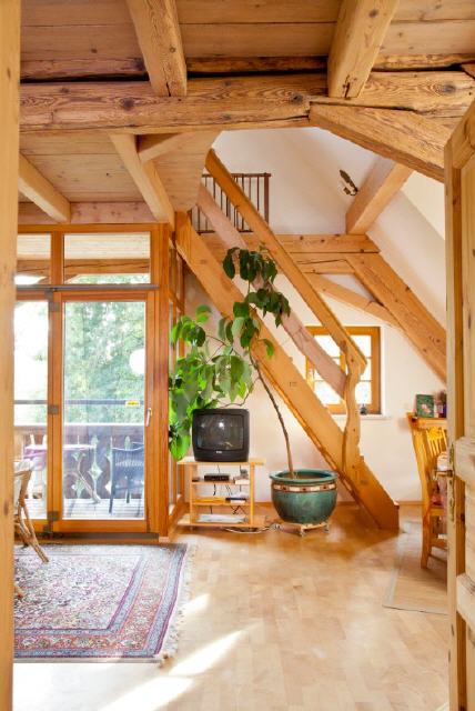 Details und Ausstattung: Liebevoll renovierte alte Balken sowie die Küchen und Möbel aus Vollholz prägen unsere Nichtraucherwohnung.