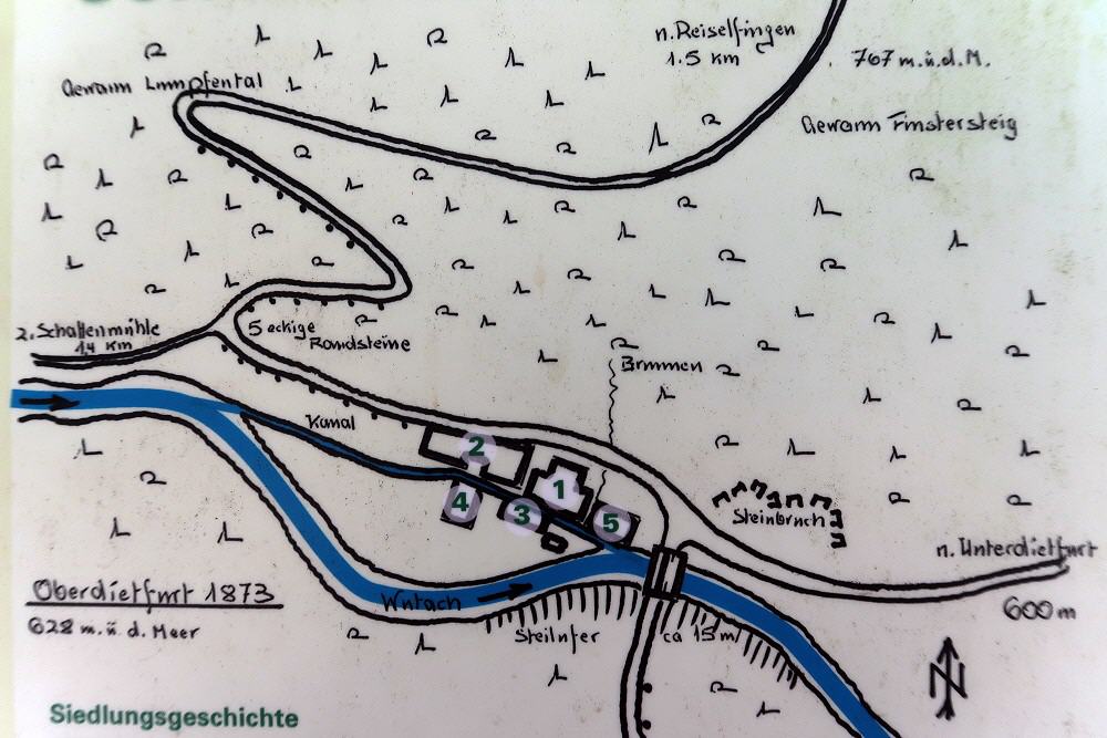 Unterhalb von Reiselfingen, einem auf der Sonnenseite der Wutachschlucht liegenden und nicht einmal 600 Einwohner zählenden Ortsteil von Löffingen, verläuft eine alte Handelsstraße. Der Übergang über die Wutach war bis 1873 die einzige Verbindung zwischen Löffingen und dem Bonndorfer Gebiet. Hier war einmal die Siedlung Dietfurt mit Mühlen und einem Gasthaus. Der Weg verläuft auf dem alten Fernweg aus der Zeit der Römer, doch heute zeugen von Ditfurt nur noch Mauerreste.