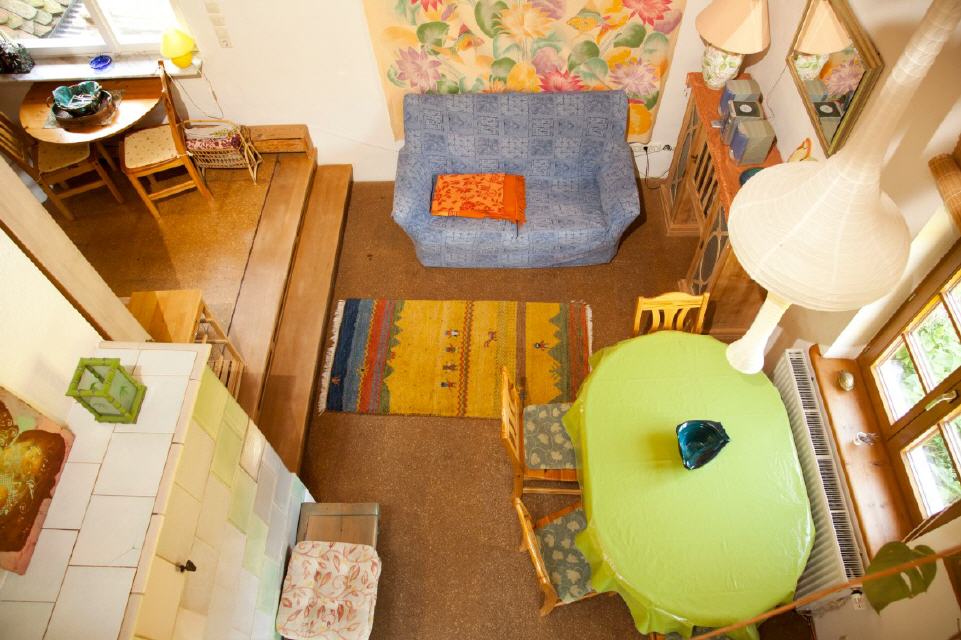 Untere Ebene: Wohnbereich mit Kachelofen; überdachter Balkon, Korkboden, Holzdecke, Küche, Bad mit Dusche und WC.