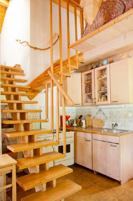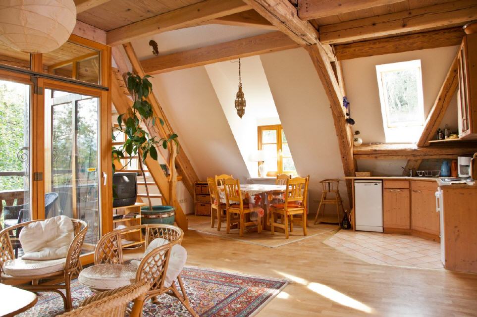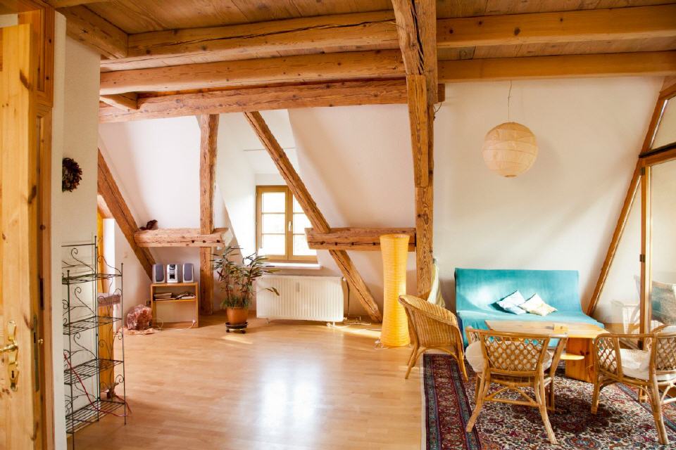 Details und Ausstattung: Liebevoll renovierte alte Balken sowie die Küchen und Möbel aus Vollholz prägen unsere Nichtraucherwohnung.