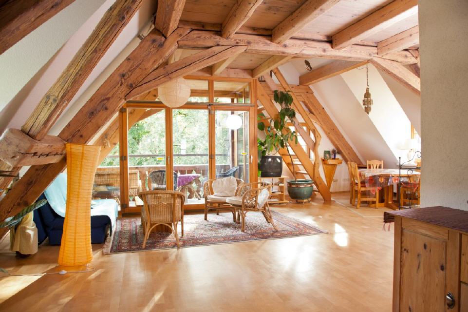 Untere Ebene: großer Wohnbereich mit Küchenecke, aufschiebbare Glaswand zur Loggia, heller Vollholzparkettboden, sichtbarer alter Dachstuhl, großes Bad mit Wanne, Dusche und WC und ein separates WC.