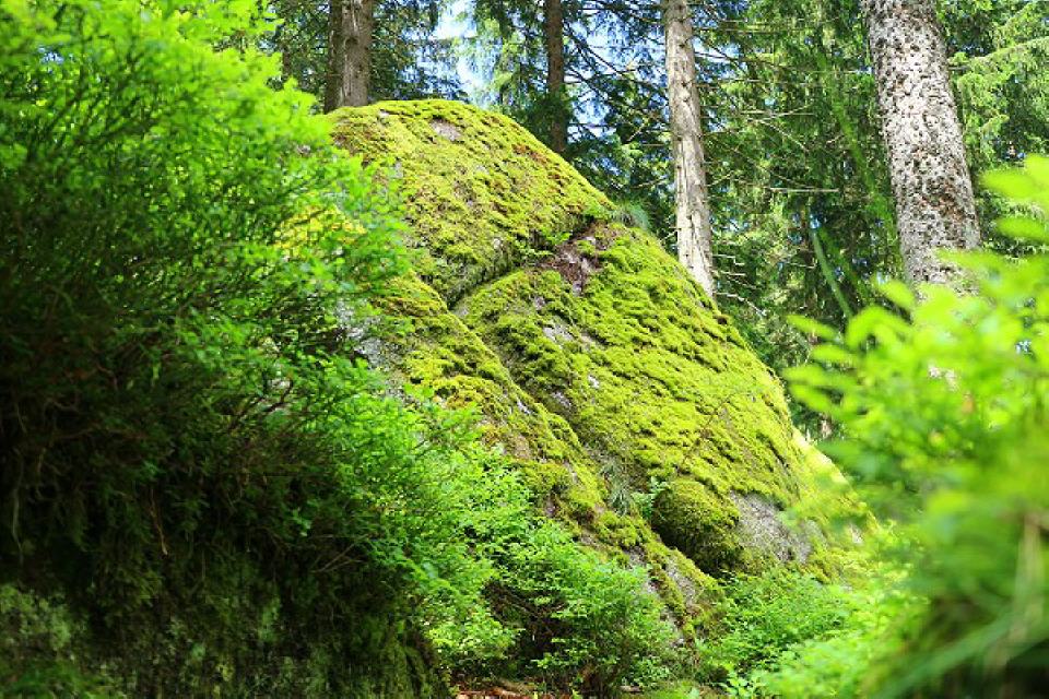 3. Augenstein. In direkter Nachbarschaft versteckt sich zwischen einigen Jungtannen ein riesiger Felsblock. Auf seiner Oberseite entdecken wir zwei fast auf einer Höhe nebeneinander liegende kreisrunde Schalen. Als hätte der Felsen seinen Blick gegen den Himmel gerichtet.