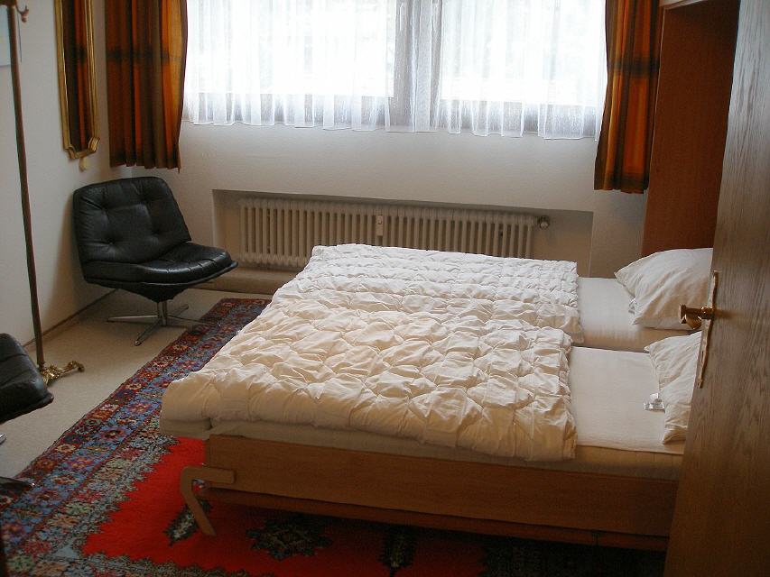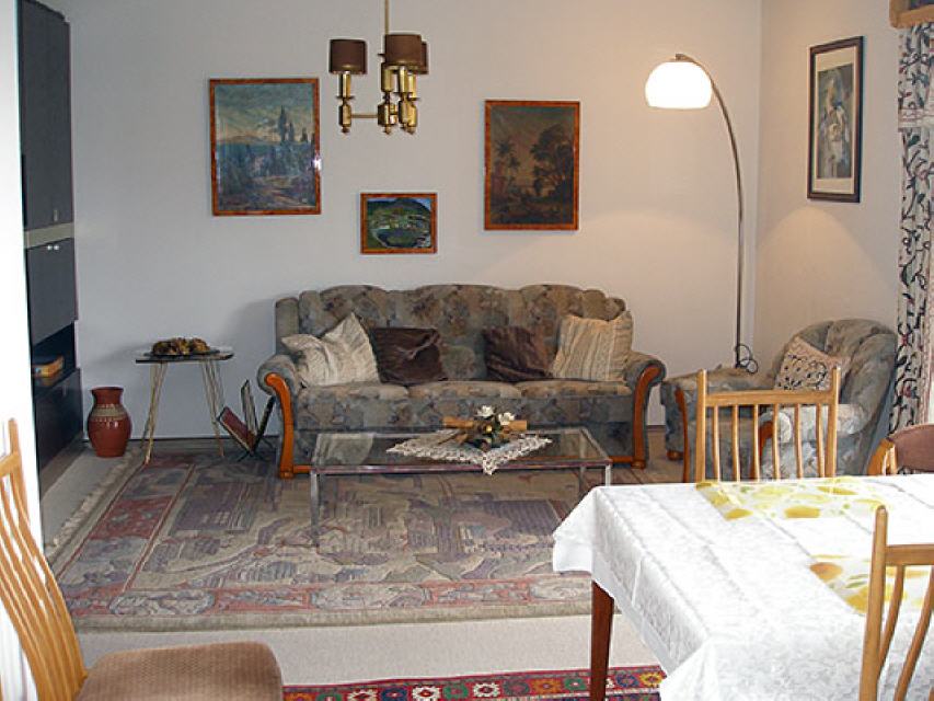 Für das gemütliche Gespräch oder den Genuss des Fernsehens steht eine Couch mit Sessel parat. Der Blick vom großen Tisch über die Dächer, verbunden mit der Ruhe, verführen zum Lesen und Relaxen. Bücher sind reichlich dafür vorhanden. Im großen, hellen Schlafzimmer kann man zwei oder nur ein Bett aus der großen Schrankwand klappen und liegt dort wie in den verborgen Betten des Wohnzimmers auf guten Matratzen bei Bedarf mit Überlänge. Die geräumige Schrankwand bietet viel Platz. Zudem stehen noch zwei kleine Sessel parat.
