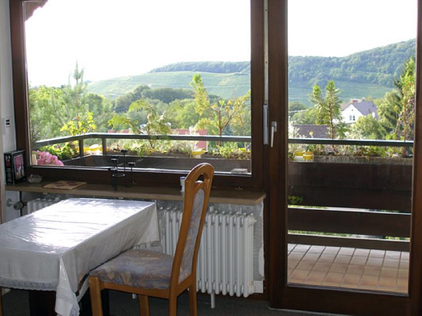 Genießen Sie den Blick vom überdachten Balkon der komfortablen Zwei-Zimmer-Ferienwohnung. Er führt weit hinaus ins Land, bei sonnigem Wetter sogar bis zu den Vogesen hinter dem Oberrheintal. Immer aber auf die Rebhänge des Römerberges, auf gepflegte Wälder und auf die nachts beleuchtete Ruine der Burg Baden.
