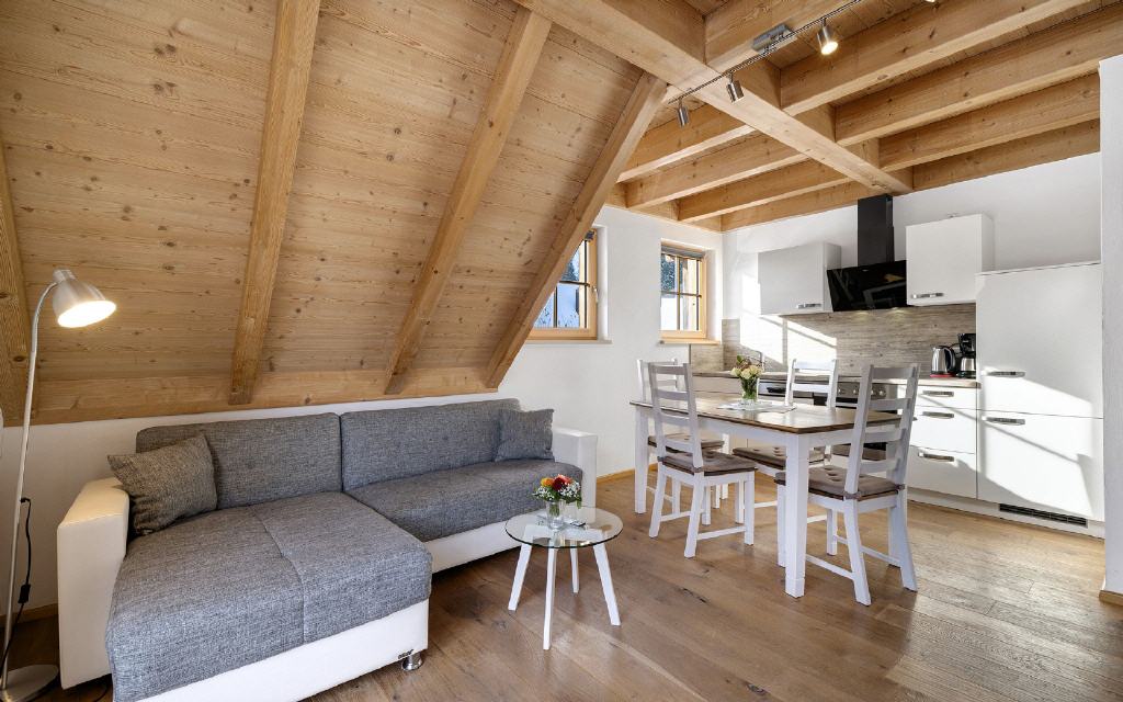 Ferienwohnung Flößerstuben: Separates Kinderzimmer, einen großen Wohn-Essraum mit Balkon und Küche, der nach oben hin zur Schlafgalerie offen ist, bei der sich auch das Badezimmer befindet. Größe ca. 80 qm. Preis 105 Euro (pro Nacht ab 4 Übernachtungen).